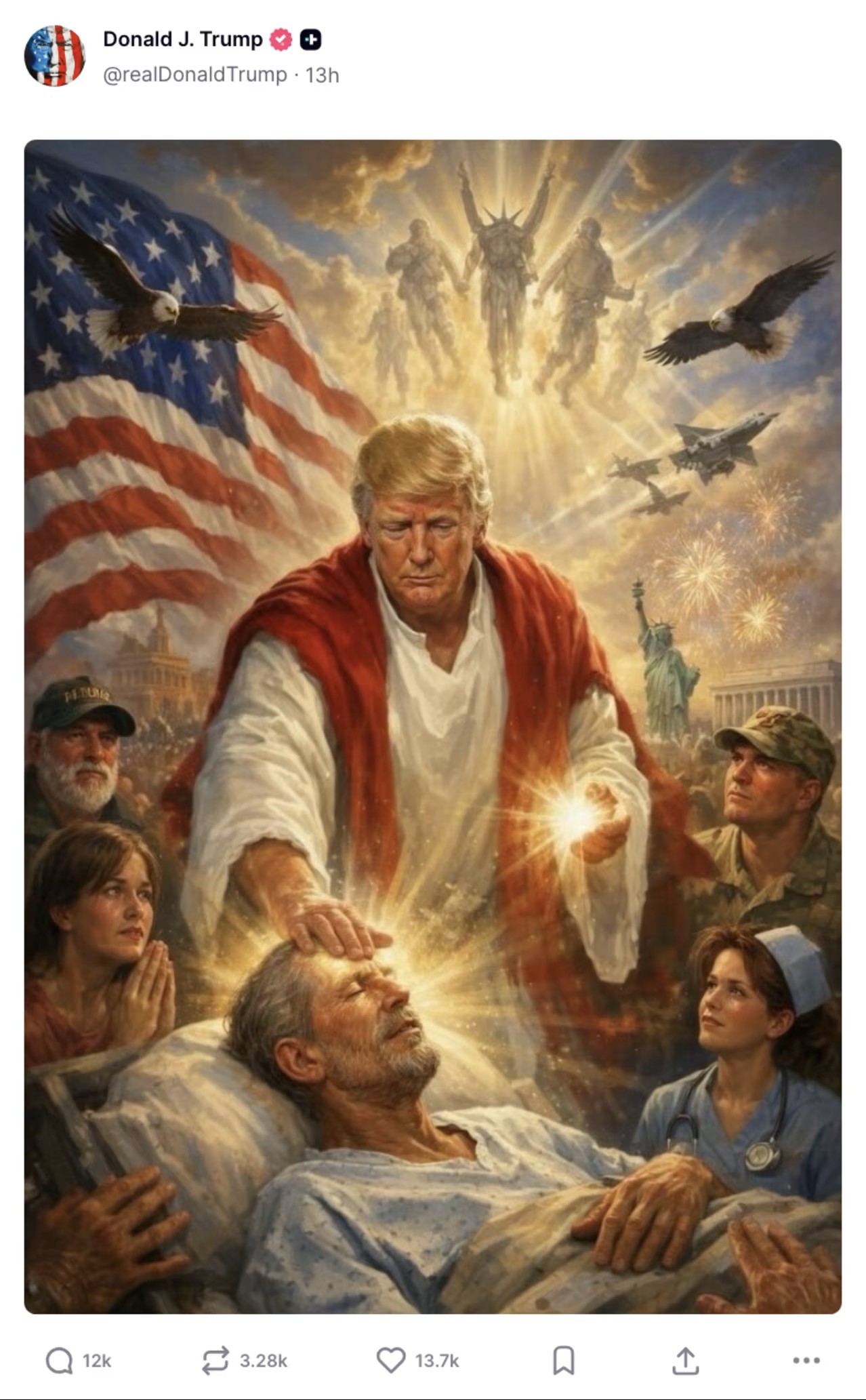 神化 April 15, 2026April 15, 2026 ~ ronnie choi 他越來越”炒作”而且好像開始走火入魔了! 要是這拼圖是他搞的,那就不能不有所警惕了. 很多政治都離不開宗教.歷史告訴我們很多統治者都利用宗教來鞏固權力.現在的伊朗便是活生生的例子.美國要是也往這方向走那所謂的世界文明和民主前景就更堪憂了! 我們不要忘記近代歷史的墨索里尼,希特勒等人都曾以救世主形象出现! 祈望,祈望這事不會真的發生.我深深相信享有二百五十年民主文明的美國人民和他們深厚的民主傳統和制度不會容許狂人政治在美國產生!希望大嘴巴的他只在搞笑而已! Share this: Share on X (Opens in new window) X Share on Facebook (Opens in new window) Facebook Like Loading... Related